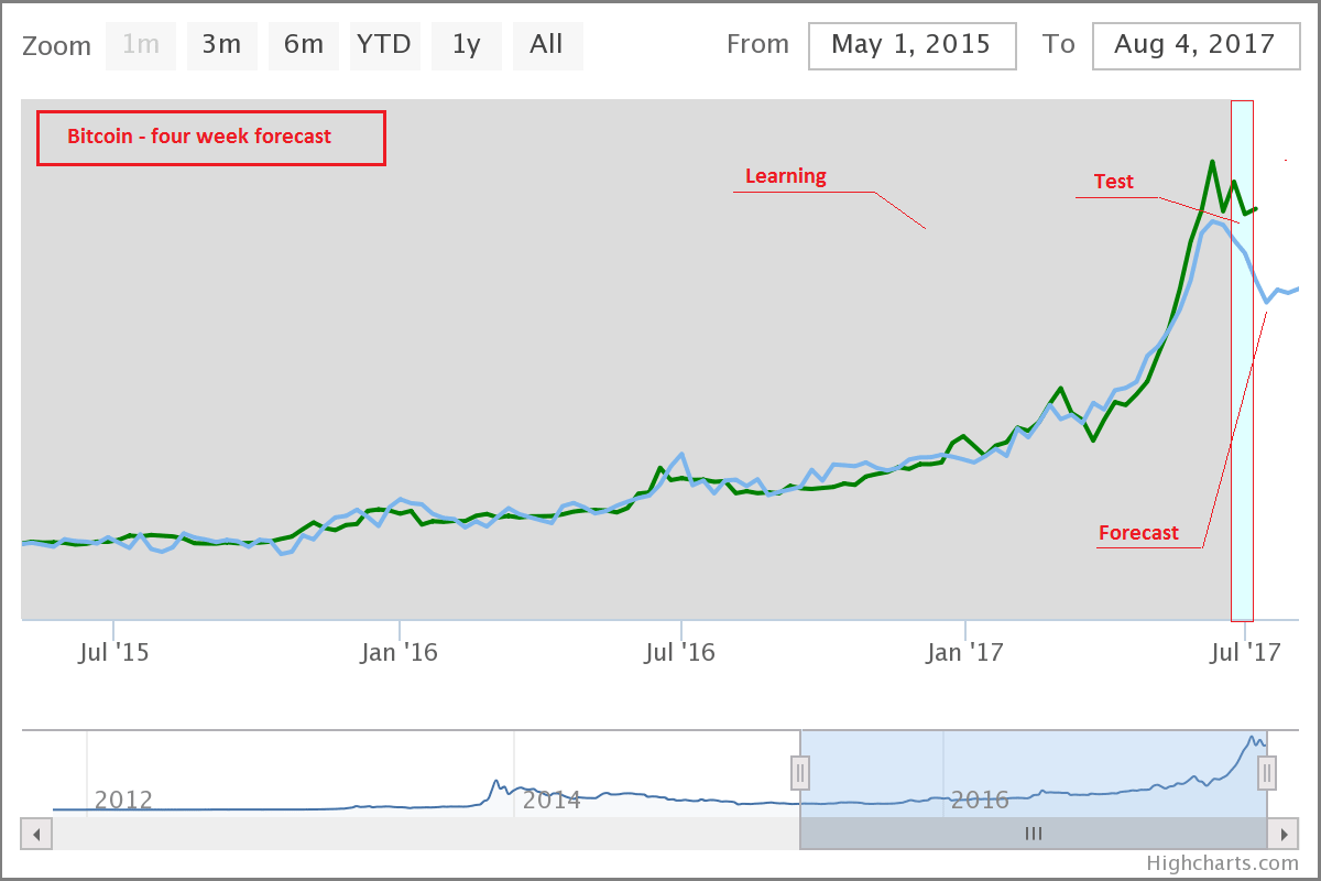 Model prawidłowo zidentyfikował istotny punkt zwrotny (szczyt), chociaż sam błąd prognozy określającej maksymalny poziom kursu był dość duży. Jednak douczenie modelu pozwoliło bardziej precyzyjnie określić zasięg korekty kursu (spadł z 2893,5 USD 10-06-2017 do 1895,64 USD 16-07-2017).