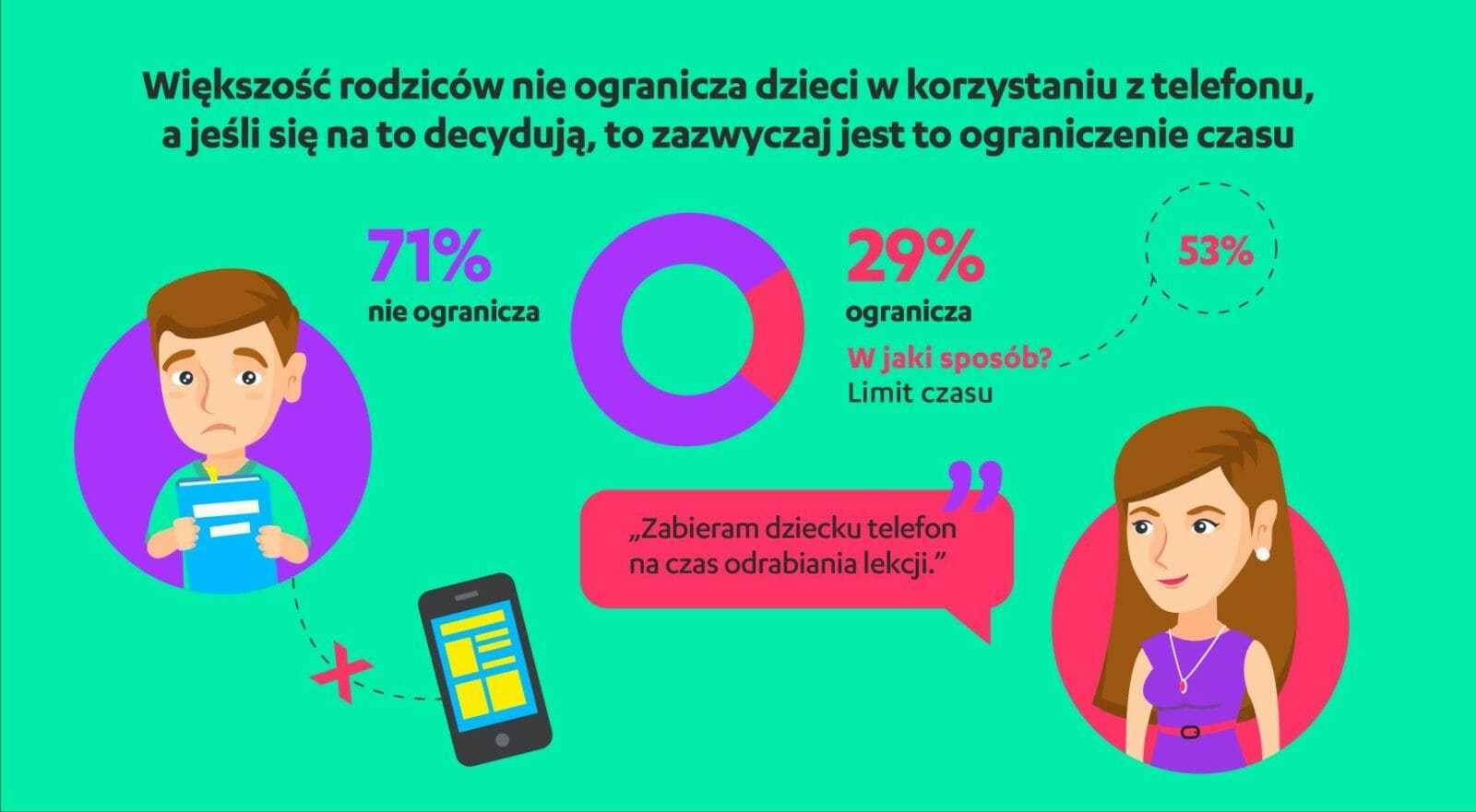 Co trzeci rodzic stara się kontrolować czas, który dziecko spędza z telefonem wprowadzając ograniczenia – najczęściej są to limity czasowe. Zdarza się również, że dostęp do smartfona traktowany jest jako element gratyfikacji, np. za to, że dziecko jest grzeczne lub wykonało swoje obowiązki. Według badania w większości polskich rodzin rozmawia się na temat bezpieczeństwa