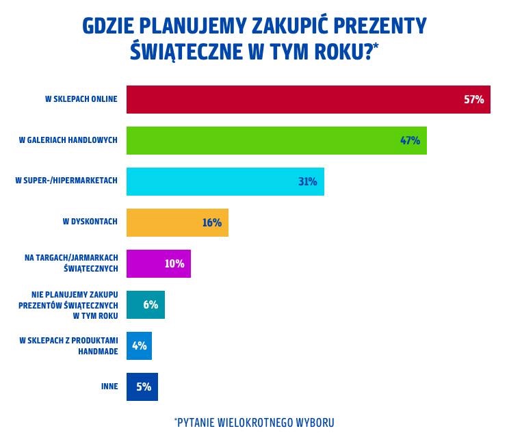 Święta dla większości to czas obdarowywania innych prezentami. Te najczęściej kupujemy w sklepach online, które wybiera 57% ankietowanych. Z kolei 47% osób udaje się do galerii handlowych, a 31% z nas kupuje upominki w super- lub hipermarketach.