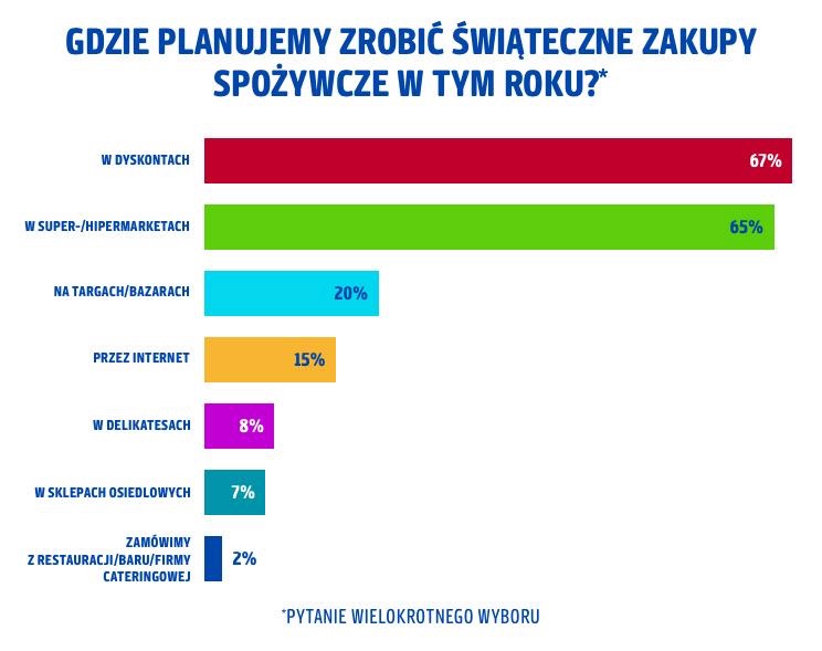 Zacznijmy od tego, czego nie może zabraknąć na święta w każdym polskim domu, czyli jedzenia, którym zwykle suto zastawiamy nasze stoły. Gdzie wybierzemy się zatem po produkty spożywcze na święta? Jak wynika z badania PAYBACK, udamy się po nie przede wszystkim do dyskontów – tak wskazało 67% ankietowanych lub do super- i hipermarketów, które odwiedzi 65% respondentów. Targi i bazary wybierze co piąty konsument, a sklepy online – 15% badanych.