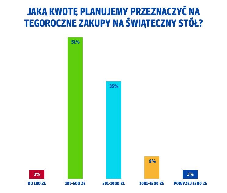 A ile w tym roku wydamy na świąteczne zakupy spożywcze? Ponad połowa ankietowanych przeznaczy na ten cel od 101 do 500 zł, 35% respondentów planuje wydać na takie zakupy od 501 do 1000 zł, a 8% – od 1001 do 1500 zł.