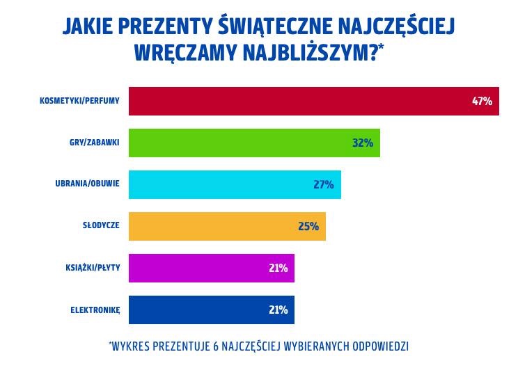 W tym roku pod naszymi choinkami najczęściej, podobnie jak w zeszłym roku, znajdą się kosmetyki i perfumy, które zamierza kupić blisko połowa badanych (47%). Bardzo popularną gwiazdkową kategorią zakupową są też gry i zabawki znajdujące się w koszykach co trzeciego respondenta, a także ubrania czy obuwie, które sprezentuje swoim najbliższym 27% ankietowanych. Wśród popularnych bożonarodzeniowych prezentów są też słodycze, wskazane przez co czwartego ankietowanego, książki i płyty (21% badanych) oraz elektronika (21%).