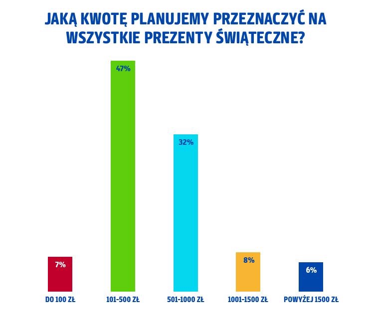 Na prezenty przeznaczymy zwykle od 101 do 500 zł (47% ankietowanych) lub między 501 a 1000 zł (32%)