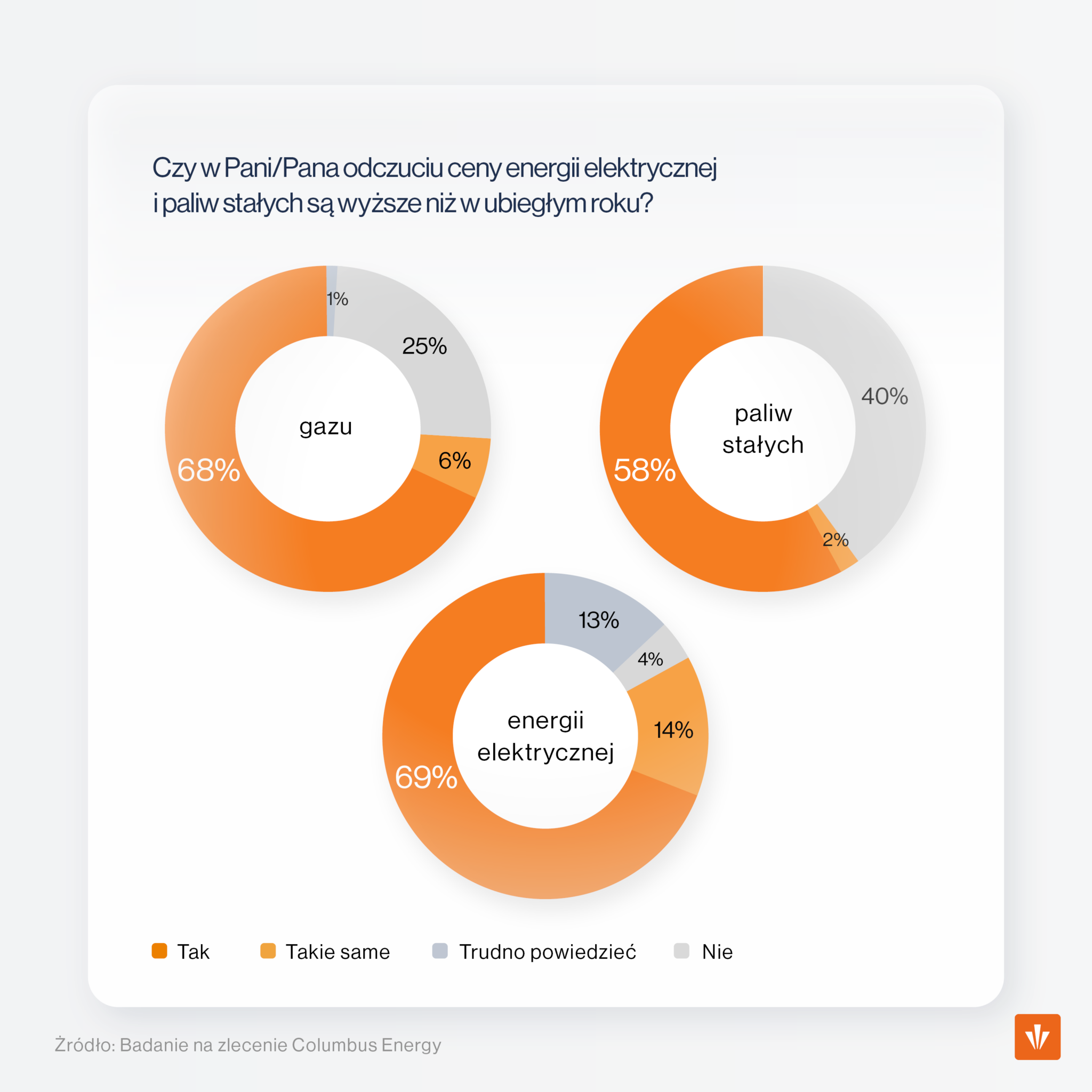 Badanie konsumenckie, przeprowadzone na zlecenie Columbus Energy na przełomie marca i kwietnia br. wykazało, że zdecydowana większość Polaków odczuwa podwyżki cen w zakresie energii elektrycznej i cieplnej – przyznaje to 7 na 10 respondentów. Tylko co piąty badany twierdzi, że nie odczuwa wzrostu cen, a co dziesiąty nie ma zdania na ten temat.