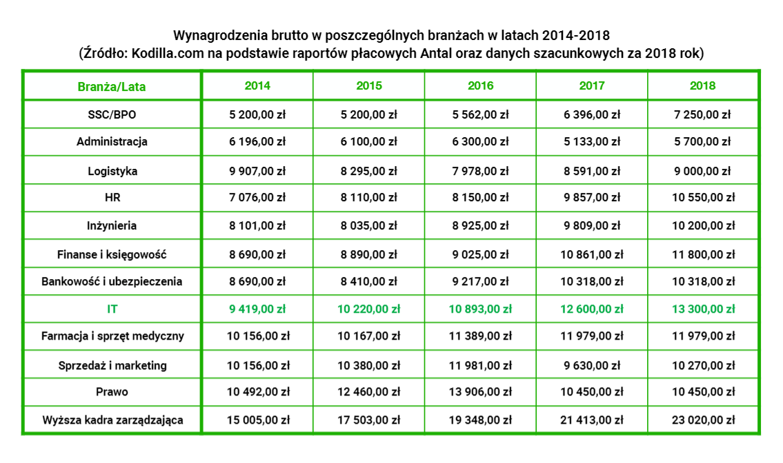 W bardzo dobrej sytuacji są także programiści. Ich zarobki od 2014 roku wzrosły średnio o 4 tys. zł. Co ciekawe, największe oczekiwania względem wynagrodzeń w branży IT obserwowane są wśród osób dopiero rozpoczynających karierę, tzw. juniorów, którzy zgodnie z danymi Antal w 2018 roku zarabiali średnio 8 tys. zł brutto (na stanowisku Junior Java Developer).