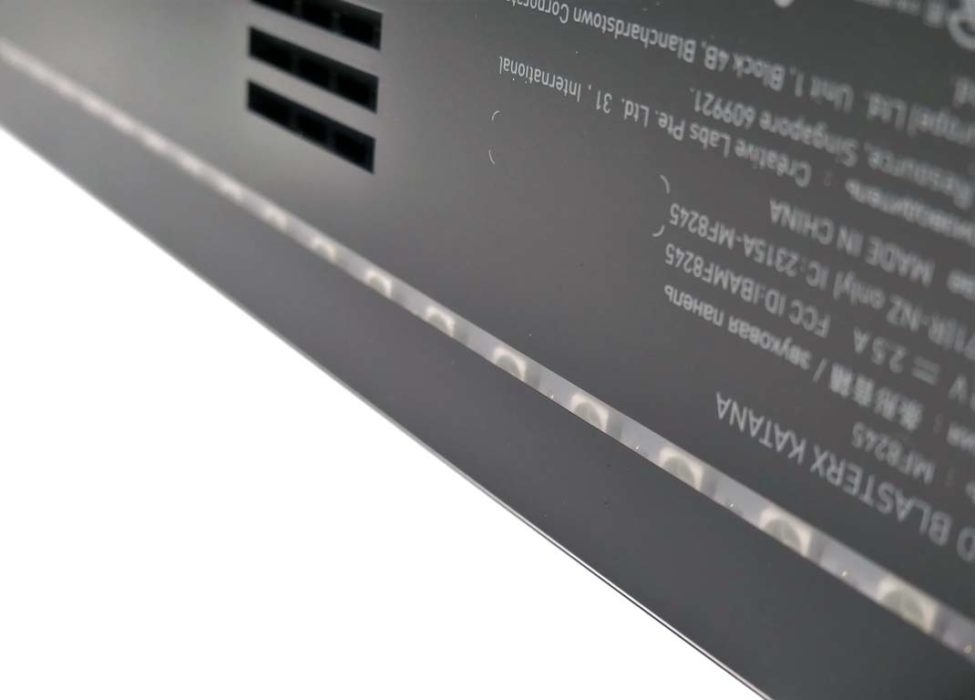Urządzenie sprawia wrażenie zaprojektowanego w przemyślany sposób. Górną część listwy pokrywa eleganckie, szczotkowane aluminium, przechylenie listwy do tyłu jest świetnym pomysłem z uwagi na przeznaczenie soundbara. Urządzenie jest solidnie wykonane, wszystkie elementy są wyprodukowane z materiałów wysokiej jakości i spasowane w prawidłowy sposób. Gamingowy charakter Katany uwydatnia się wraz z uruchomieniem urządzenia. Katana posiada bowiem system oświetlenia Aurora Reactive. Tworzy go 49 diod umieszczonych pod listwą. Ich kolor oraz sposób emisji światła można dowolnie dostosować za pomocą aplikacji. Oświetlenie można dostosować do trybów pracy, brak jest jednak możliwości zintegrowania dynamiki pracy diod do dźwięku.
