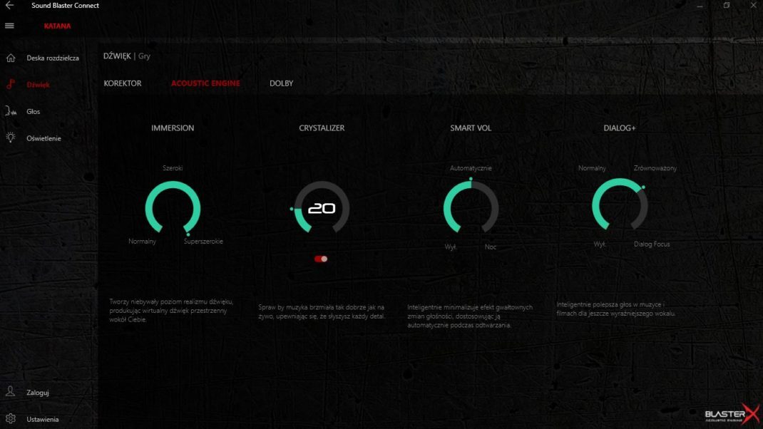 Wyjęcie z opakowania, podłączenie zestawu, uruchomienie i zanurzenie się w dźwięku to dopiero początek magii jaka nas czeka. Cała zabawa zaczyna się po zainstalowaniu oprogramowania Creative na komputerze – wtedy Katana zaczyna pełnić funkcję karty dźwiękowej z najwyższej półki.
