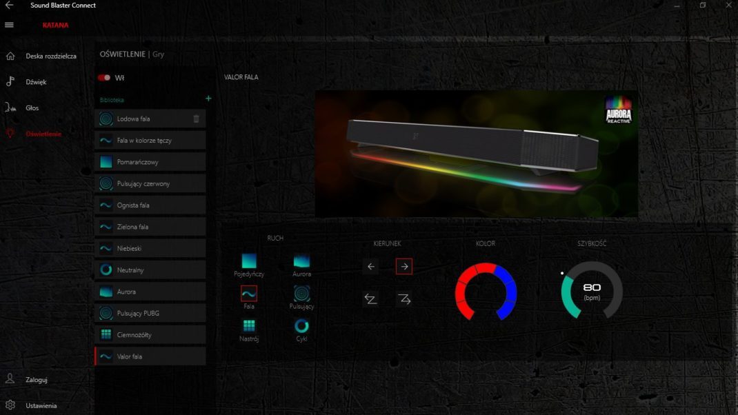 Wszystkie ustawienia możemy zapisać w postaci „szczelin” (trybów) – ustawiamy tam jakość audio za pomocą equalizera, funkcji podzielonych w grupy. Mamy również do dyspozycji panel ustawień oświetlenia, w którym ustawimy podświetlanie w siedmiu obszarach (każdy oddzielnie z ponad szesnastu milionów kolorów oraz kierunek i efekt poruszania się fali światła.