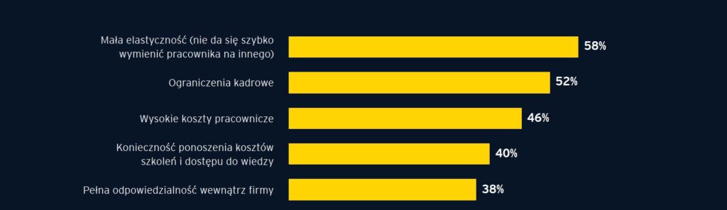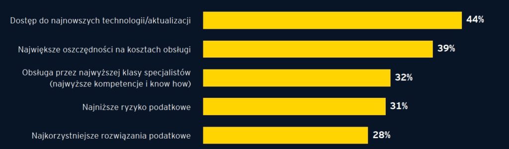 Polscy CFO szczególnie chętnie spoglądają w kierunku wsparcia w zakresie doradztwa podatkowego (73%). Wśród największych zalet co-sourcingu usług księgowo-podatkowych wskazują na dostęp do najlepszych technologii (44%) oraz oszczędności na kosztach obsługi (39%). Ostatni obszar silnie koreluje ze wskazanymi przez CFO wadami księgowości wewnętrznej. Dyrektorzy finansowi wskazują przede wszystkim na trudności z szybkim zastąpieniem osoby, która odeszła z organizacji (58%), ograniczenia kadrowe (52%) i wysokie koszty pracownicze (46%).