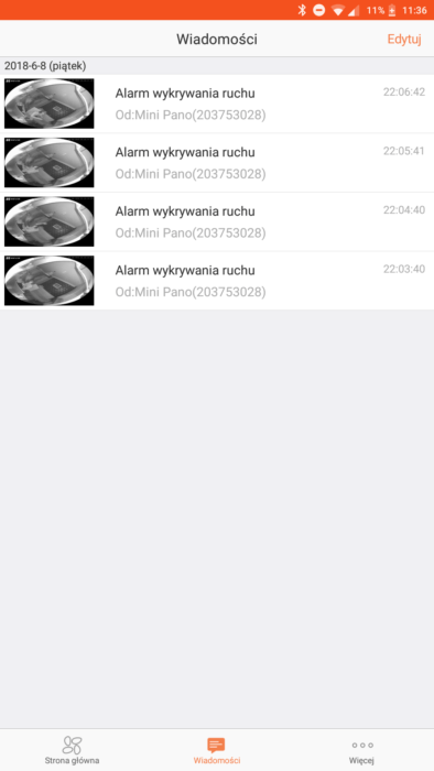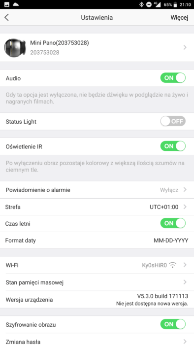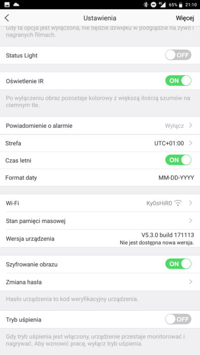 Nad wszystkim czuwa oczywiście aplikacja, którą konfigurujemy według własnego uznania. Możemy przybliżać i oddalać obraz, ustawić tryb kamery (rybie oko, panorama 180 stopni, panorama 360 stopni, podział ekranu na cztery części) wraz z typem montażu (ścienny/sufitowy). Dodatkowo szyfrowanie obrazu, które przy dodawaniu urządzenia jest wymuszane (prawidłowo!). Mamy możliwość sterowania diodami informującymi o działaniu urządzenia (włącz/wyłącz), włączeniu doświetlenia diodami IR. Możemy ustawiać powiadomienia o alarmie (czujnik ruchu), gdzie skonfigurujemy plan, kiedy kamera ma nas powiadamiać o ruchu i w jaki sposób (powiadomienia PUSH, krótki sygnał dźwiękowy, długi i głośny sygnał dźwiękowy, jako alarm przeciwwłamaniowy). Nie ma przeszkód, by używać również reklamowanej przez producenta funkcji czatu głosowego. Przy dobrej jakości połączenia, funkcja działa poprawnie z lekkim opóźnieniem. Jakość audio jednak nie jest powalająca. Pamiętajmy jednak, że nie jest to urządzenie, którego głównym zadaniem jest przetwarzanie dźwięków, więc jest to usprawiedliwione. Kamera wspiera również dwa tryby nagrywania – standard i Hi-Def. Nie zauważyłem jednak znaczących różnic pomiędzy nimi.