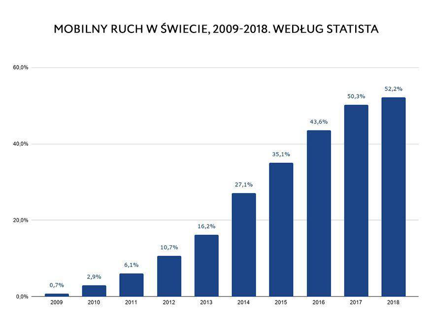 Udział ruchu mobilnego nieubłaganie rośnie. Nic dziwnego – szybki Internet staje się coraz bardziej dostępny (m.in. darmowe hotspoty w miejscach publicznych, niskie opłaty za dane komórkowe czy przyłączenie do sieci w domach), a użytkownicy mogą nabyć urządzenia mobilne w niezwykle atrakcyjnych cenach. Co więcej, strony i aplikacje są przystosowane do obsługi na urządzeniach mobilnych, przez co użytkownik może w każdym miejscu, w łatwy i intuicyjny sposób skorzystać z potrzebnego narzędzia – np. zrobić zakupy online, zamówić taksówkę czy sprawdzić godziny otwarcia restauracji.