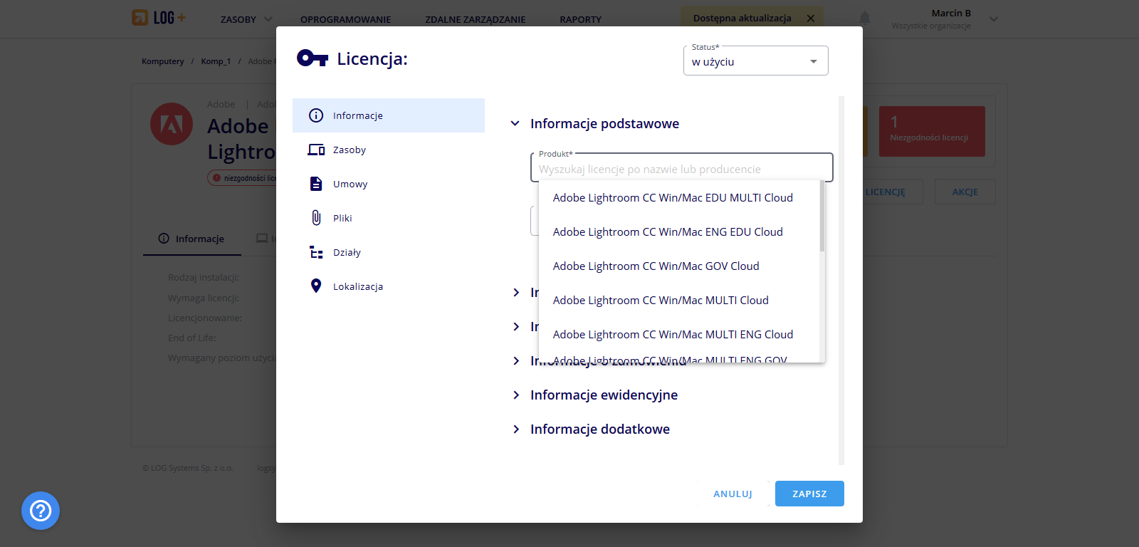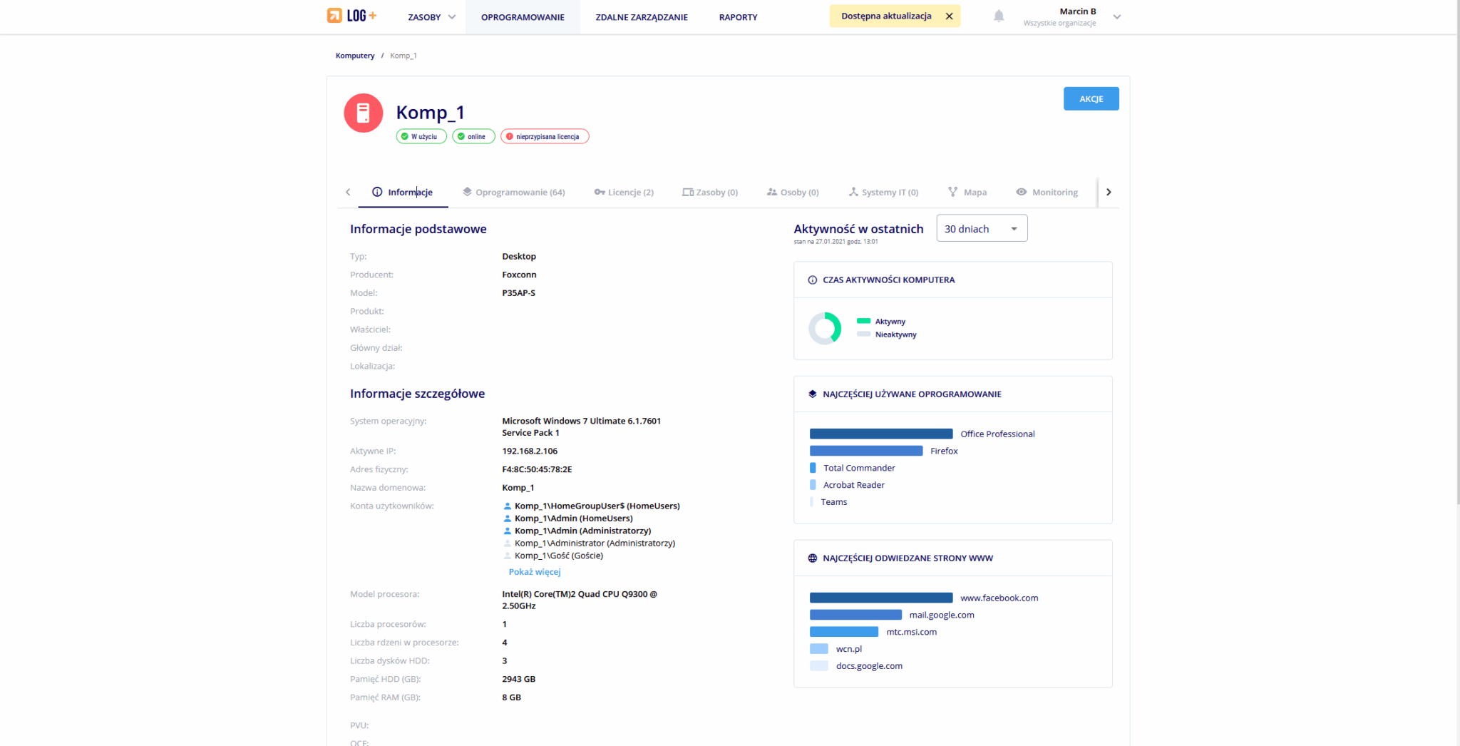 Wbudowana w LOG Plus baza oprogramowania, automatycznie rozpoznaje aplikacje znajdujące się na urządzeniach końcowych. Z punktu widzenia administratora, istotna jest funkcja automatycznego rozpoznawania rodzaju licencji, wraz z uprawnieniami do obniżenia ich wersji. Opcja ta przydaje się w chwili, gdy Agent nie rozpozna jednostanowiskowych licencji na oprogramowanie, które zainstalowane jest na komputerze użytkownika. Tak też było w moim przypadku – Agent nie wydobył z systemu kluczy rejestracyjnych i nie oznaczył mojego oprogramowania jako legalnego software’u z przydzielonymi licencjami. Musiałem je więc poprzydzielać „ręcznie” z poziomu oprogramowania LOG Plus.