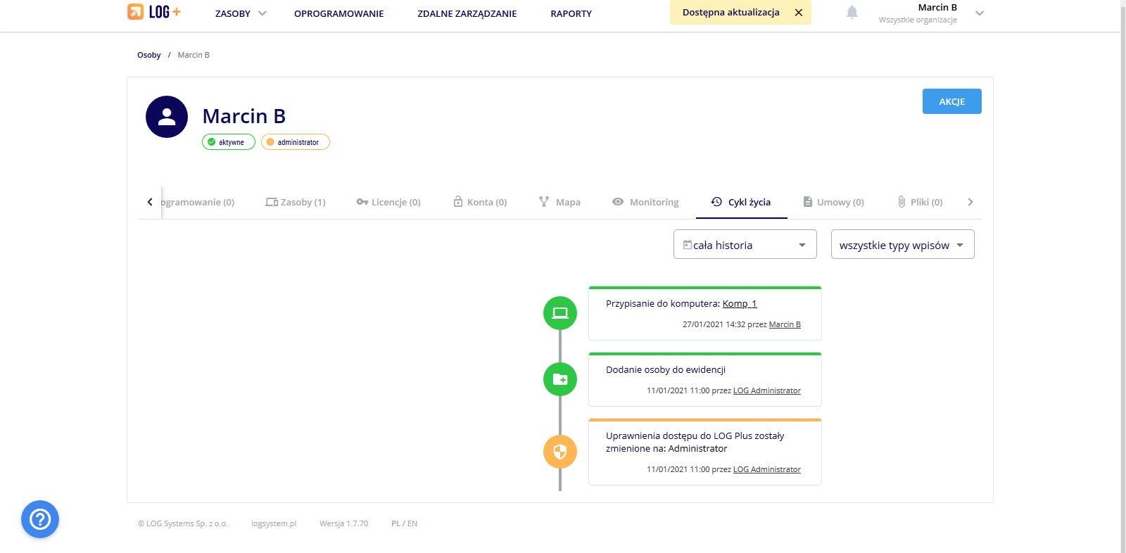 Oprogramowanie LOG Plus dzieli nasze zasoby na Osoby, Komputery, Serwery, Maszyny Wirtualne, Infrastrukturę sieciową, Pozostałe elementy sieci, Urządzenia mobilne, Monitory, Drukarki, Nośniki danych i czytniki, Systemy informatyczne, Oprogramowanie, Licencje oraz Umowy. Pomiędzy zasobami istnieją powiązania, które można śledzić i analizować, a także stworzyć własne, np. przypisanie konkretnych komputerów do działu księgowości. Najbardziej oczywistą z nich jest relacja osoba-komputer-oprogramowanie-licencja. Jednym kliknięciem można też przejść od jednego, do drugiego powiązanego zasobu. Na przykład, od komputera do programów, a następnie do przypisanych poszczególnym aplikacjom licencji.