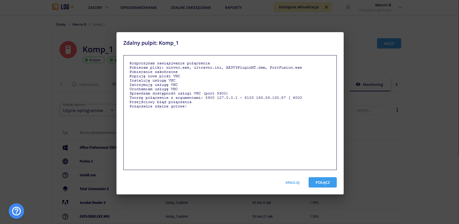 Zdalny pulpit pozwala przejąć kontrolę nad komputerem użytkownika. Dzięki temu, administrator może rozwiązać „na odległość” większość pojawiających się problemów dotyczących konfiguracji lub problemów związanych z korzystaniem z firmowych programów. Za tą funkcjonalność odpowiada zainstalowany na urządzeniu końcowym Agent i portal administracyjny. Aby podłączyć się do wybranego urządzenia zdalnym pulpitem, wystarczy wywołać funkcję Zdalnego pulpitu, korzystając z przeglądarki internetowej, nawet na urządzeniu mobilnym.