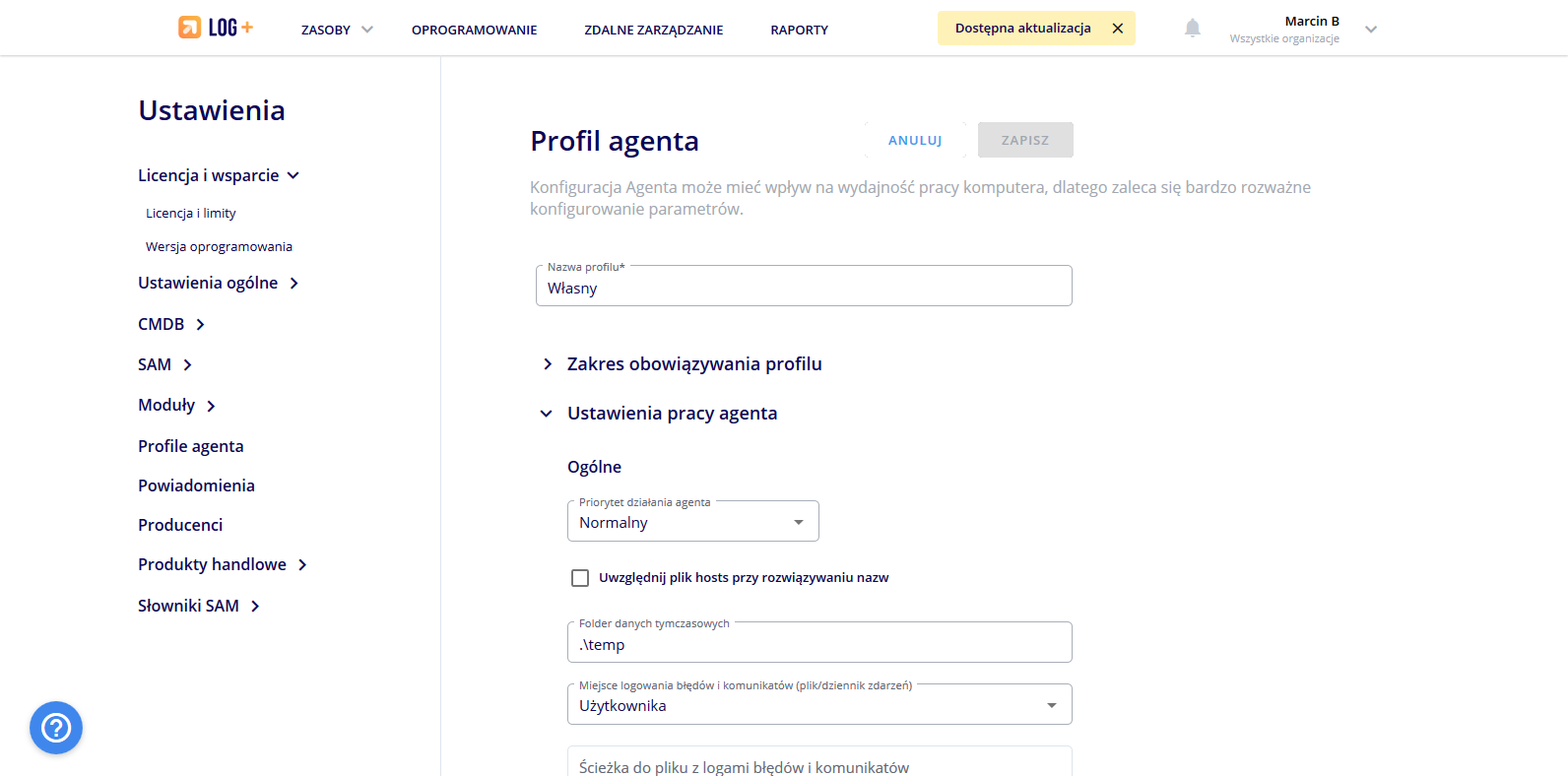 W ustawieniach Profili Agenta zdefiniować można własne parametry związane z audytem sprzętu i oprogramowania, w tym ścieżki dostępu do skanowanych zasobów, typów plików czy kluczy rejestru. Działanie Agenta można skonfigurować również z określeniem działu, w którym znajduje się komputer, jego lokalizacji czy konkretnego użytkownika. Dzięki temu, użytkownik otrzymuje przejrzyste dane, dostosowane do jego indywidualnych potrzeb.