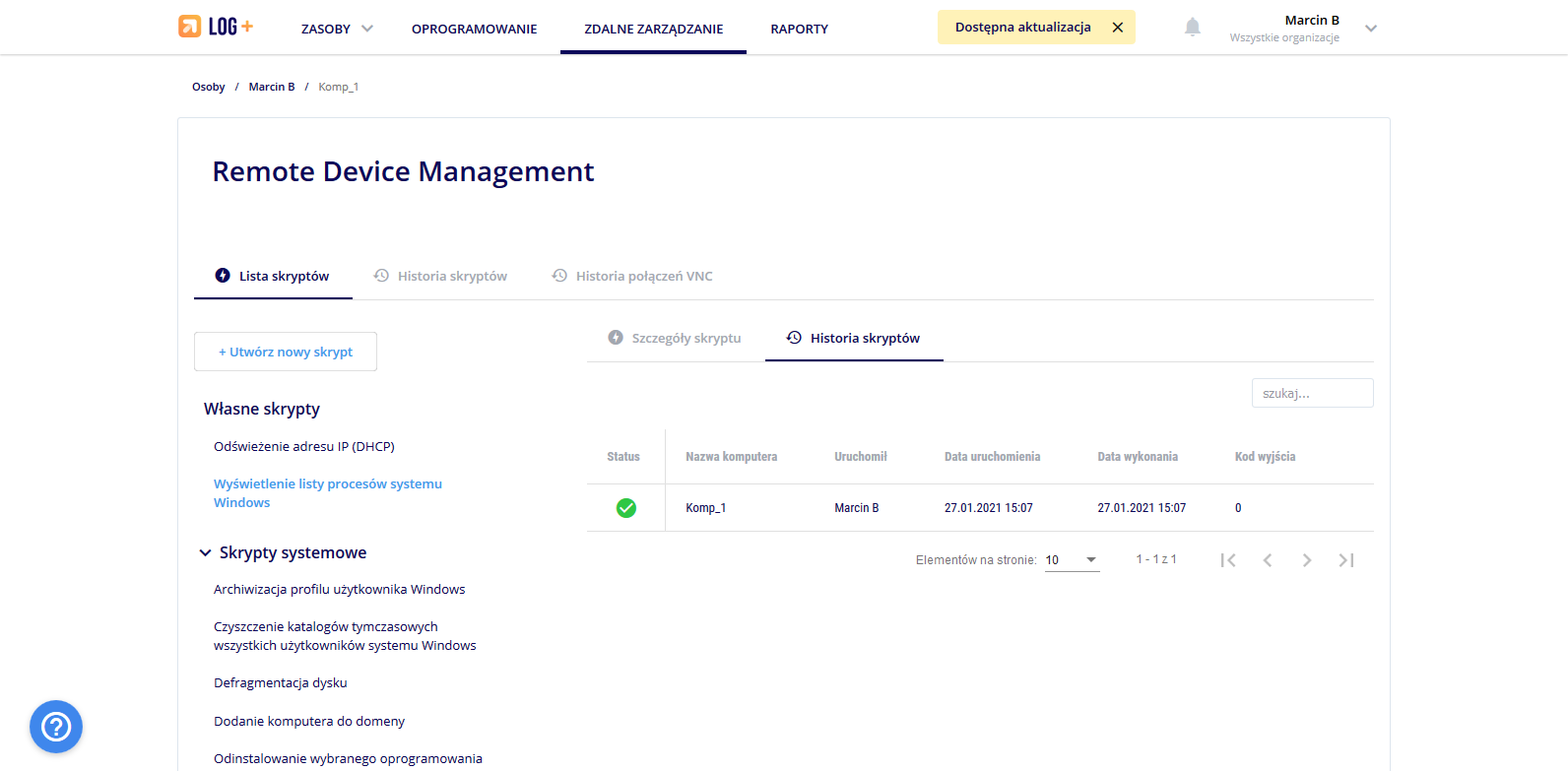 Każdy skrypt możemy własnoręcznie edytować, dzięki temu łatwo go przeanalizować i poprawić. Oczywiście, możliwe jest również przygotowanie własnych skryptów. Dostępna jest też opcja importu z dysku gotowych skryptów PowerShell lub Batch. Wszystkie skrypty mogą być uruchamiane z możliwością parametryzacji. Możemy też zlecić ich wykonanie zarówno dla pojedynczego komputera, jak i dla grupy urządzeń końcowych. W LOG Plus użytkownik ma również dostęp do historii uruchomień oraz informacji o statusie wykonania poszczególnych skryptów.