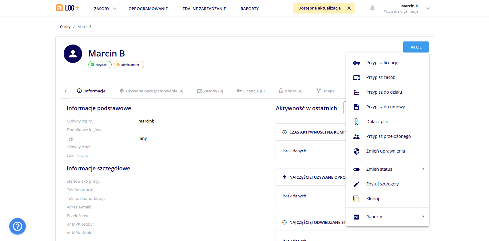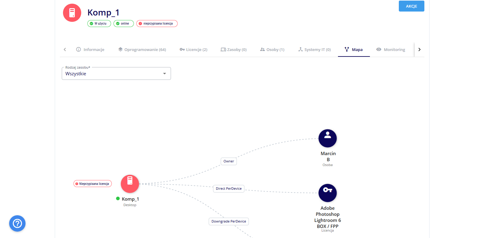 Zagłębiając się w kwestię zasobów i ich przypisania do osób i działów, każdy zasób ma swoja kartę informacyjną, zawierającą szczegółowe charakterystyczne dla niego informacje. Mogą to być zainstalowane na danym komputerze programy, czy też informacje o konfiguracji sprzętowej. Licencje, którymi dysponujemy możemy w dowolnej chwili edytować, zmienić powiązanie lub dołożyć nowe, w chwili, gdy zakupiono dodatkowe lub nowe oprogramowanie. Takie zasoby można przypisać albo do komputera, albo bezpośrednio do osoby. Dzięki temu, użytkownik korzystający z oprogramowania w chmurze, może z niego korzystać na dowolnym urządzeniu.