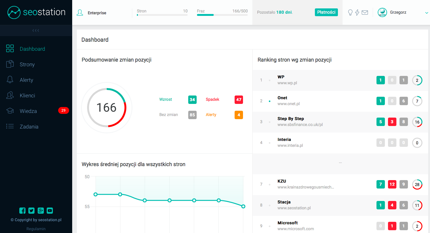 SeoStation to narzędzie, będące odpowiedzią na potrzeby zarówno zaawansowanych, jak i również początkujących osób, poszukujących sposobów na sprawdzanie pozycji stron w Google. Narzędzie jest kompleksową propozycją, która doprowadza do automatyzacji codziennego monitorowania postępów w złożonym procesie pozycjonowania stron internetowych w wyszukiwarce Google. W SeoStation masz dostęp do analizowania postępów przy pomocy łatwych w odczycie wykresach i widokach. Narzędzie zapewnia aktualne informacje w kontekście, takim jak: liczba linków zwrotnych, ilość domen linkujących, zmiana ruchu na stronie WWW, czy pozycja dla danych fraz.