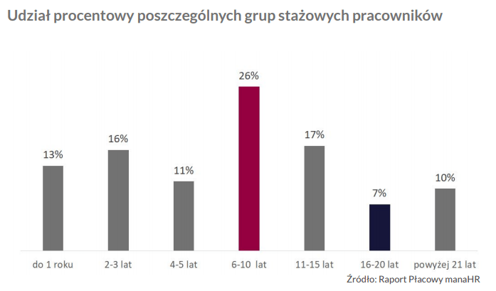 Z badań przeprowadzonych przez specjalistów z firmy manaHR wynika, że długość stażu pracy zależna jest też od stanowiska, jakie obejmuje pracownik. W firmach produkcyjnych najdłuższy staż mają wykwalifikowani robotnicy i liderzy. Najkrótszy – początkujący robotnicy i młodsi specjaliści – nie tylko pracują najkrócej z racji młodego wieku, ale są to też grupy cechujące się najwyższym wskaźnikiem fluktuacji.