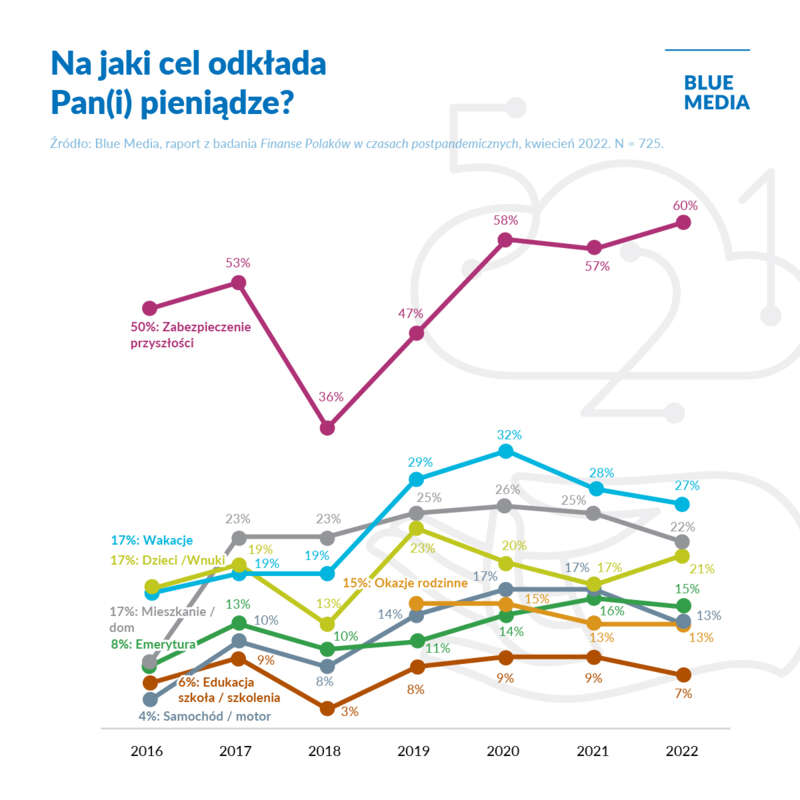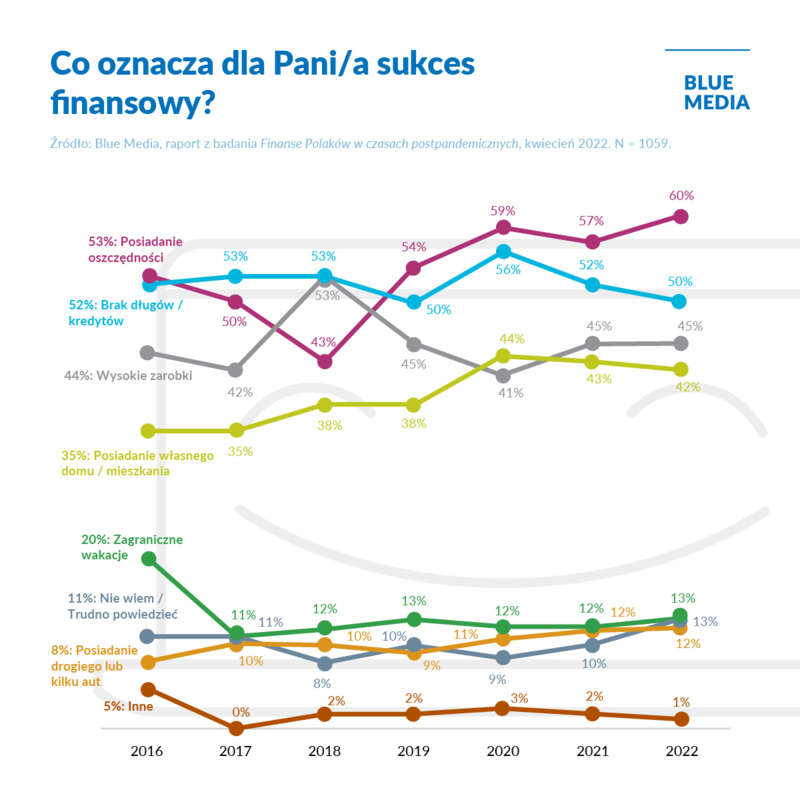 Blue Media bada postawy Polek i Polaków wobec zagadnień finansowych cyklicznie począwszy od 2016 roku. Dzięki badaniu możemy dostrzec zmieniające się podejście Polaków do pieniędzy na przestrzeni lat.