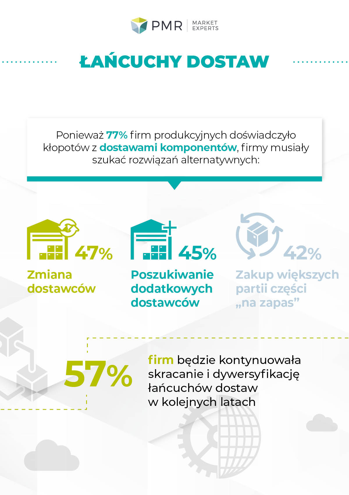 Respondenci w większości przypadków nie rozważali również rezygnacji z zagranicznych dostawców części (64%), choć jedynie 18% przyznało, że tylko zagraniczni kooperanci posiadają komponenty potrzebne im do produkcji. Zaledwie co dziesiąta firma, która miała kłopoty z dostawami, zrezygnowała z usług zagranicznych dostawców. Pokazuje to, że polscy producenci wydają się nie zmieniać podejścia do kwestii globalnych łańcuchów dostaw, na przykład poprzez współpracę z lokalnymi dostawcami, co mogłoby ograniczać potencjalne ryzyko w przyszłości.