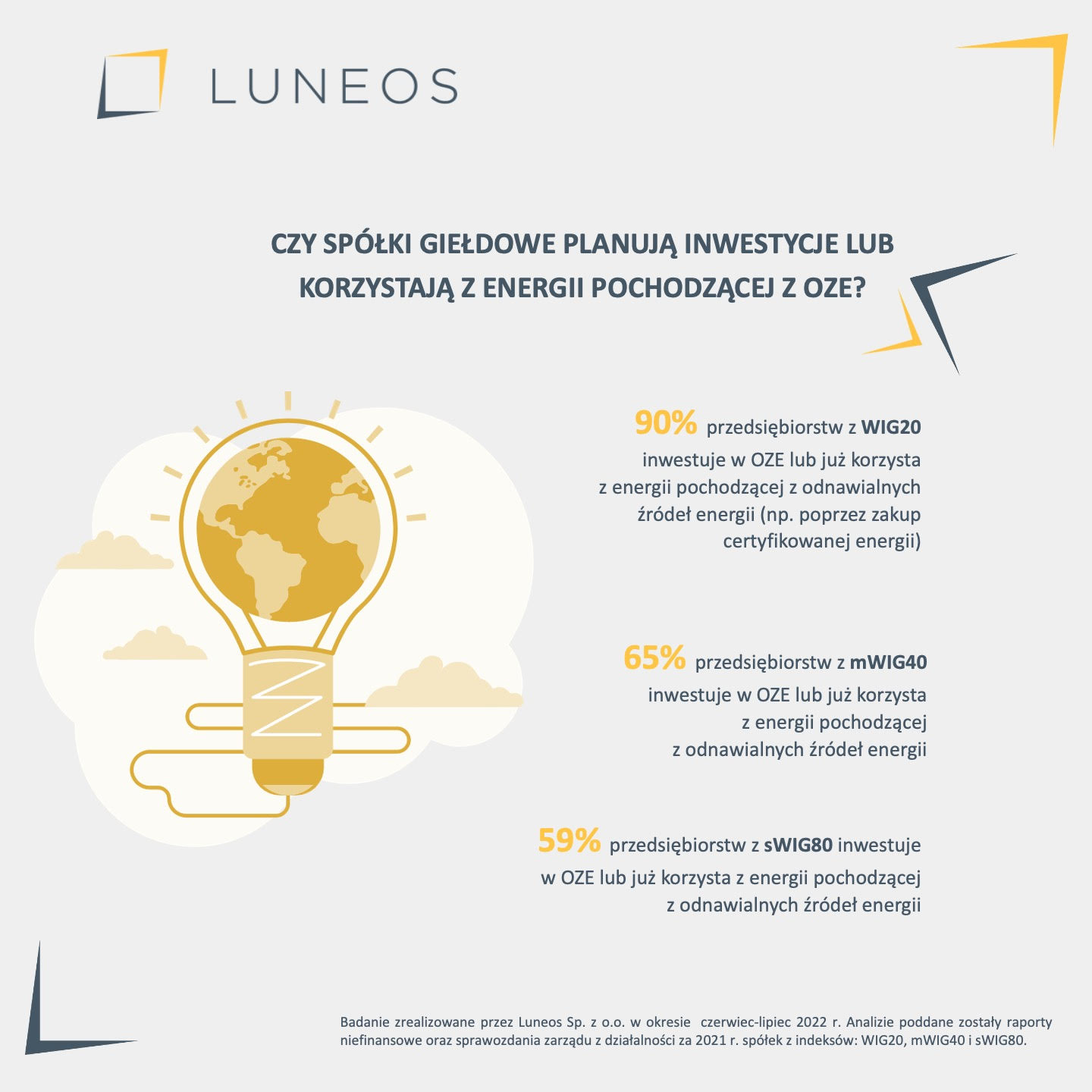 Badanie Luneos zostało wykonane w czerwcu i lipcu 2022 r. Analizie poddanej były raporty niefinansowe oraz sprawozdania zarządu z działalności za 2021 r. spółek z indeksów: WIG20, mWIG40 i sWIG80. W raportach i sprawozdaniach spółek giełdowych poszukiwana była odpowiedź na pytanie – czy spółka planuje inwestycje lub korzysta z energii pochodzącej z OZE? Innymi słowy, czy dane przedsiębiorstwo giełdowe odnosi się w swoich raportach do tematu odnawialnych źródeł energii. Odpowiedź była twierdząca, gdy np. spółka podawała ile proc. energii zużywanej w przedsiębiorstwie było generowanych z własnych instalacji fotowoltaicznych, jaki proc. stanowiła zakupiona zielona energia od zewnętrznych podmiotów, jakie są plany inwestycyjne spółki w kwestii OZE, itp.