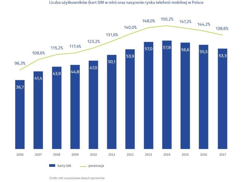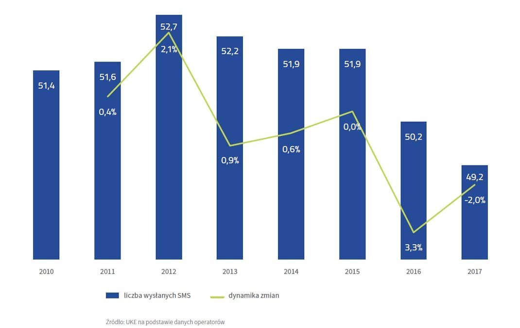 Urząd Komunikacji Elektronicznej opublikował coroczny „Raport o stanie rynku telekomunikacyjnego w Polsce w 2017 roku” z którego wynika, że na koniec minionego roku aktywnych było ponad 53 milionów kart SIM, czyli o 4% mniej niż w 2016 roku. To jedna z prawdopodobnych przyczyn spadku liczby SMS-ów wysłanych przez użytkowników polskich sieci. W 2017 roku Polacy łącznie nadali 49,2 miliarda krótkich wiadomości tekstowych, o 2% mniej niż 12 miesięcy wcześniej. Innym powodem spadku liczby wysłanych SMS-ów jest rosnąca wciąż popularność mobilnych komunikatorów oraz portali społecznościowych.