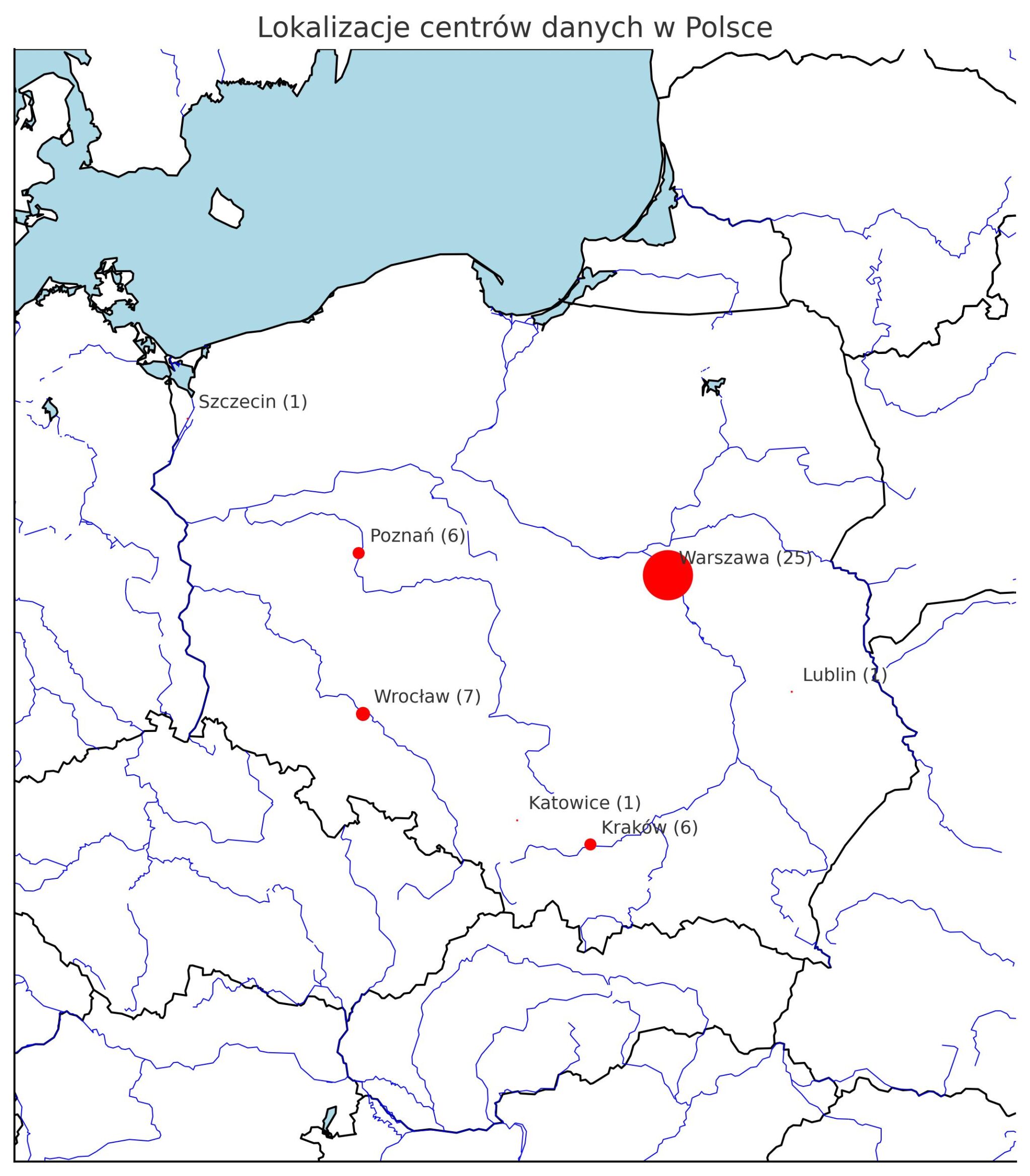 Koncentracja centrów danych w określonych regionach, takich jak Warszawa, prawdopodobnie odzwierciedla obecność kluczowych ośrodków biznesowych, głównych węzłów wymiany ruchu internetowego oraz rozwiniętej infrastruktury telekomunikacyjnej. Przedsiębiorstwa zazwyczaj lokują swoją infrastrukturę IT w pobliżu swojej działalności oraz tam, gdzie dostępna jest szybka łączność internetowa. Duże miasta, takie jak Warszawa, charakteryzują się większą koncentracją firm i lepszą infrastrukturą, co przyciąga inwestycje w centra danych. Szacuje się, że Warszawa gości około 28 do 48 centrów danych, co stanowi znaczną część krajowej infrastruktury.