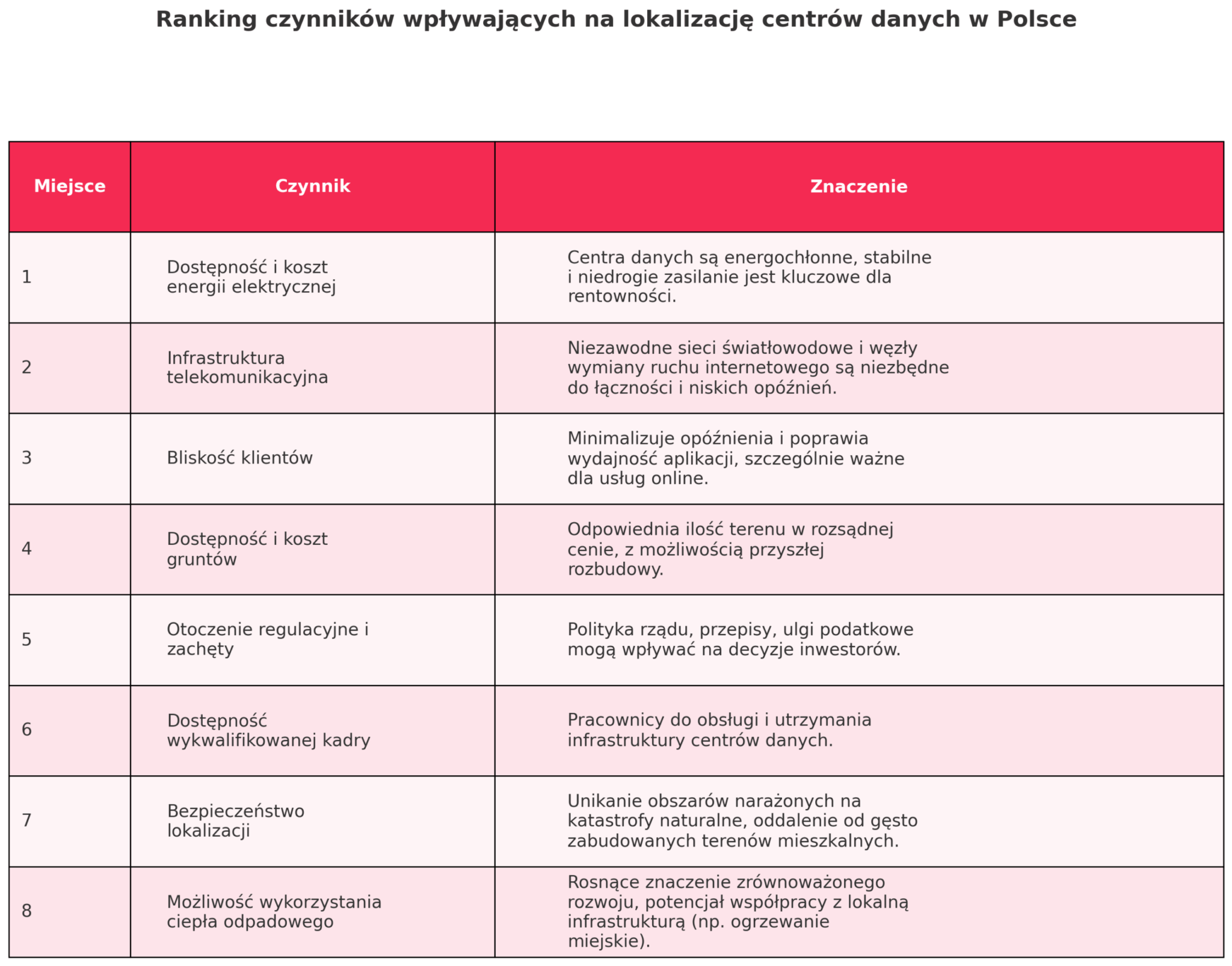 Lokalizacja centrów danych jest strategiczną decyzją, na którą wpływają takie czynniki jak bliskość klientów, dostępność infrastruktury telekomunikacyjnej, koszt i dostępność energii, gruntów oraz otoczenie regulacyjne. W przyszłości oczekuje się dalszego wzrostu rynku, napędzanego przez trendy takie jak chmura obliczeniowa, big data, IoT i transformacja cyfrowa. Polska ma potencjał, aby stać się ważnym graczem na europejskim rynku centrów danych, jednak musi sprostać wyzwaniom związanym z konkurencją, dostępnością kadr i zrównoważonym rozwojem.