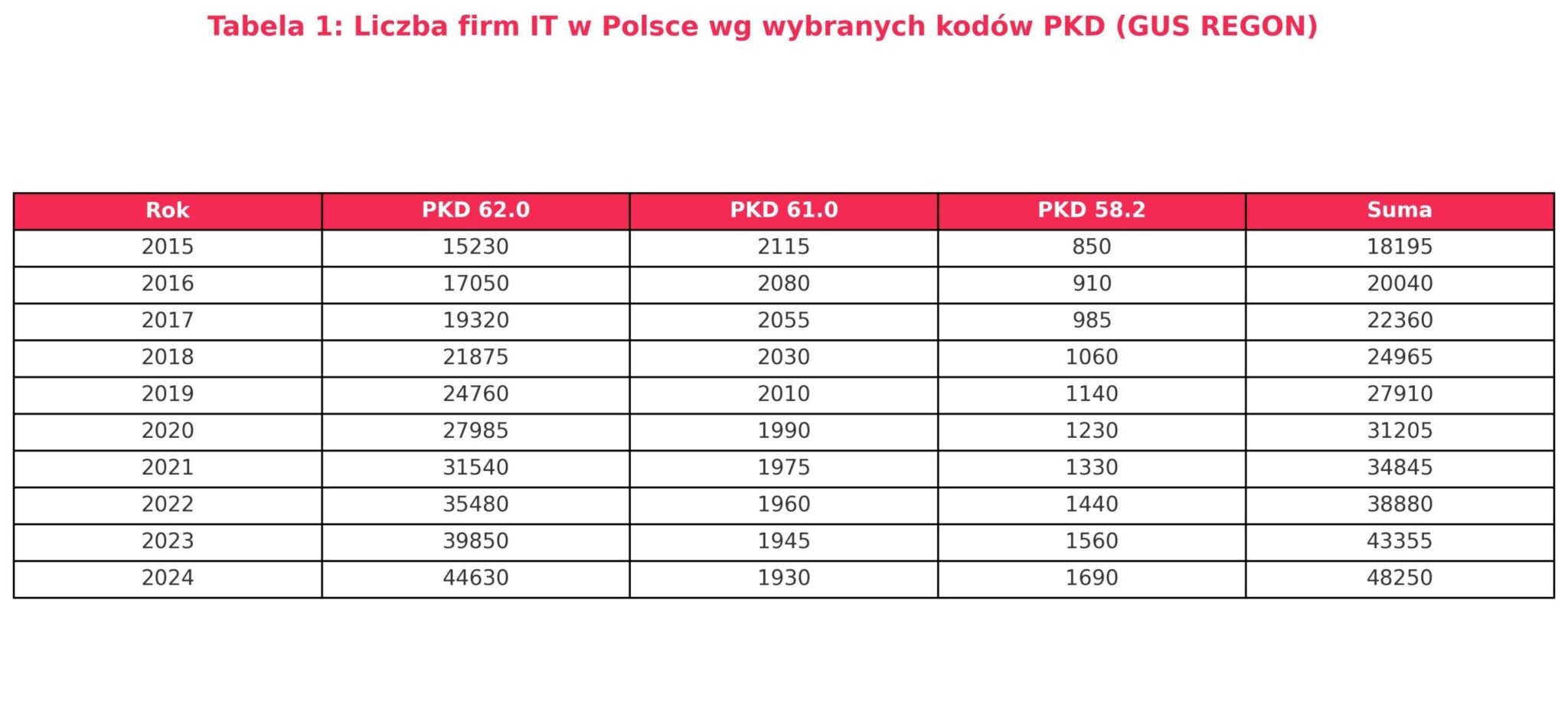 Poniżej przygotowałam analizę danych pochodzących z GUS REGON (sekcja J – Informacja i komunikacja) oraz CEIDG, z uwzględnieniem kluczowych kodów PKD bezpośrednio związanych z sektorem IT. Skupimy się na kodzie 62.0, obejmującym działalność związaną z oprogramowaniem i doradztwem w zakresie informatyki oraz działalność powiązaną, kodzie 61.0, dotyczącym telekomunikacji, oraz kodzie 58.2, odnoszącym się do działalności wydawniczej w zakresie oprogramowania i gier komputerowych. Głównymi obszarami naszej analizy będą ogólna liczba firm w sektorze IT, dynamika ich wzrostu na przestrzeni ostatnich lat, struktura zatrudnienia w tych firmach oraz zjawisko dominacji mikrofirm i potencjalny wzrost udziału firm świadczących usługi IT. Przedstawimy również planowane tabele i wnioski, które pozwolą na dogłębne zrozumienie polskiej sceny IT w liczbach.
