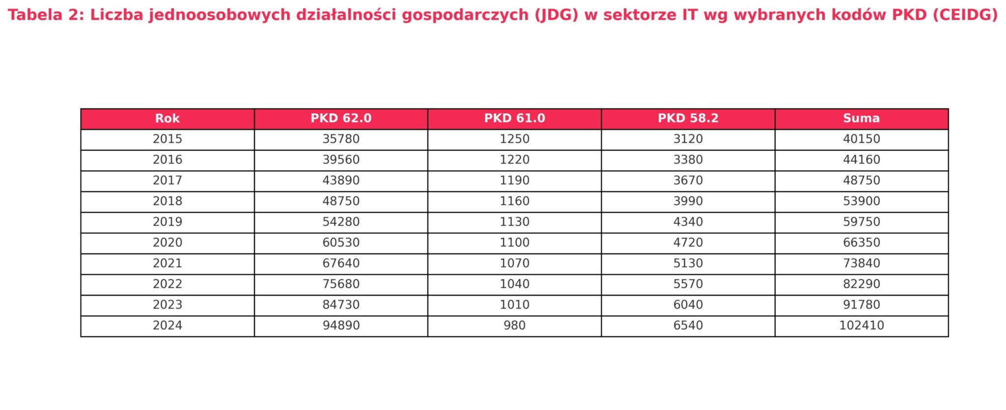 Nie można również pominąć wpływu bieżących wydarzeń rynkowych i technologicznych. Pandemia COVID-19 przyspieszyła cyfryzację wielu aspektów życia i gospodarki, co zwiększyło popyt na usługi IT. Rozwój pracy zdalnej umożliwił wielu specjalistom IT prowadzenie działalności z dowolnego miejsca, co mogło przyczynić się do wzrostu liczby jednoosobowych działalności gospodarczych. Popularność outsourcingu IT, w którym Polska od lat zajmuje silną pozycję , również stymuluje rozwój firm świadczących usługi IT.