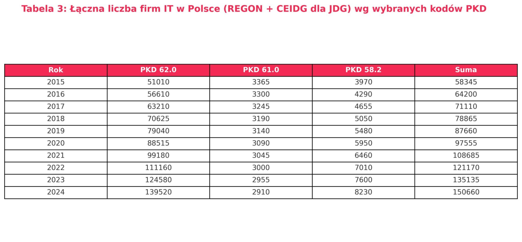 Tabela 3 przedstawia łączną liczbę firm IT w Polsce, będącą sumą firm z REGON (Tabela 1) i jednoosobowych działalności gospodarczych z CEIDG (Tabela 2) dla wybranych kodów PKD. Dane te dają szacunkowy obraz całkowitej liczby podmiotów działających w kluczowych segmentach IT w Polsce. Ogólnie rzecz biorąc, tempo wzrostu liczby firm IT w Polsce jest bardzo dynamiczne, a najbardziej znaczący wzrost obserwuje się w obszarze działalności związanej z oprogramowaniem i doradztwem IT (PKD 62.0). Wzrost ten jest napędzany zarówno przez powstawanie nowych firm, jak i przez zakładanie jednoosobowych działalności gospodarczych. Sektor telekomunikacyjny (PKD 61.0) wykazuje stabilną, a nawet lekko spadkową tendencję w liczbie firm, co może wskazywać na konsolidację rynku lub wysokie bariery wejścia dla nowych podmiotów. Działalność wydawnicza w zakresie oprogramowania (PKD 58.2) również rośnie, choć wolniej niż segment usług IT.