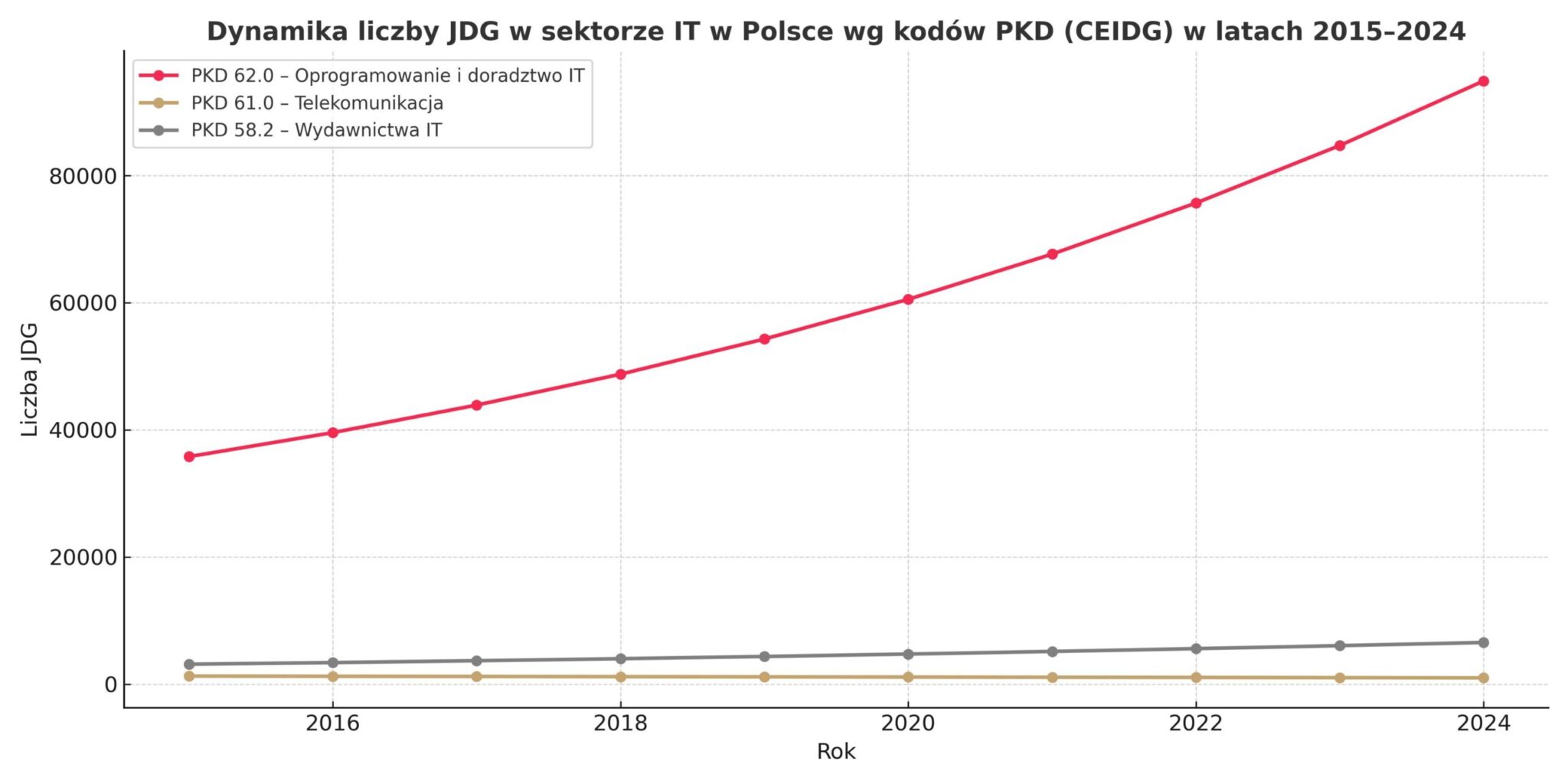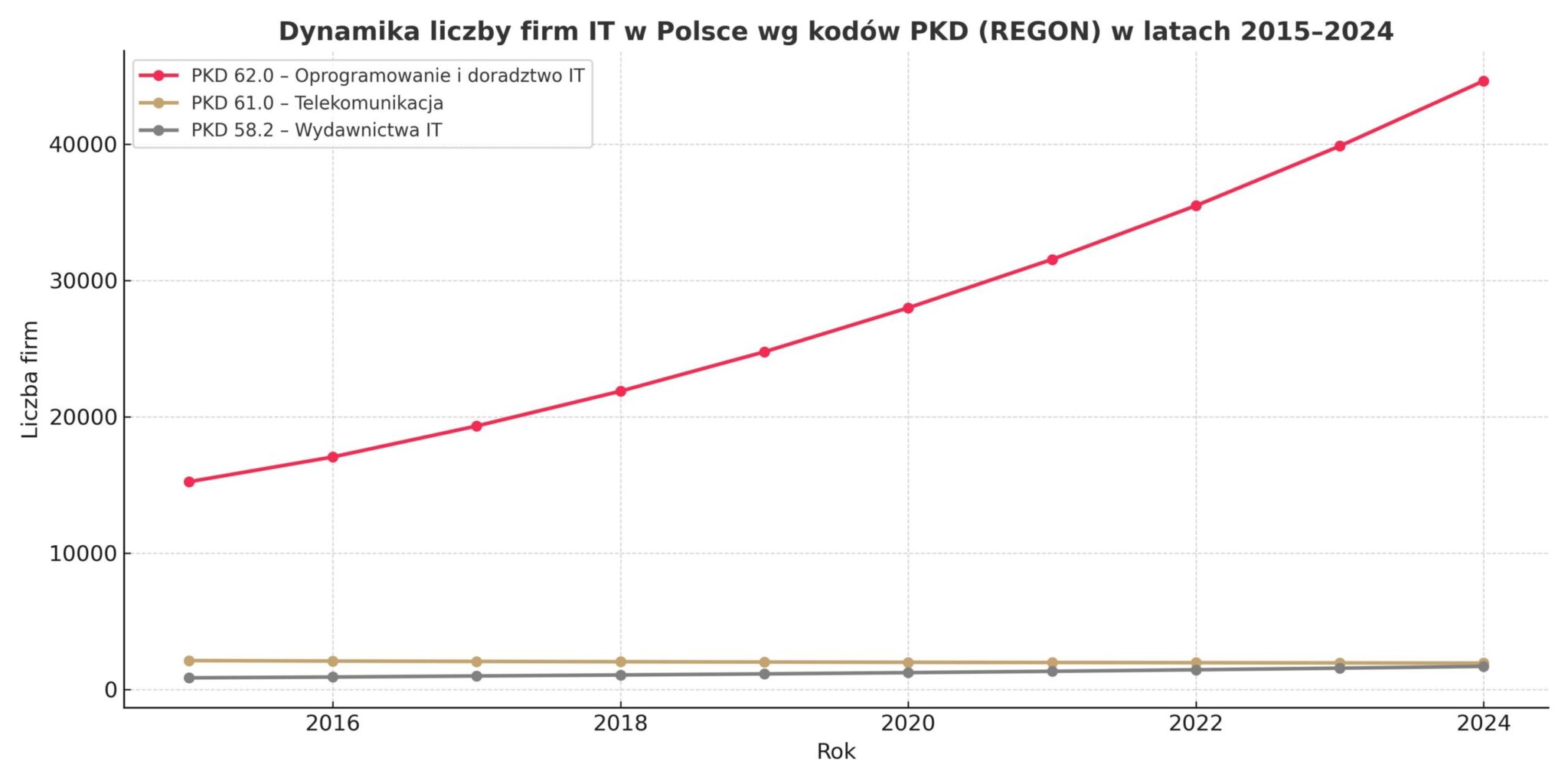 Analiza danych z GUS REGON i CEIDG za lata 2015-2024 ujawnia kilka kluczowych trendów dotyczących liczby i wzrostu firm IT w Polsce. Przede wszystkim, sektor IT jako całość wykazuje dynamiczny wzrost, a motorem tego wzrostu jest przede wszystkim segment działalności związanej z oprogramowaniem i doradztwem w zakresie informatyki (PKD 62.0). Zarówno liczba firm zarejestrowanych w REGON, jak i liczba jednoosobowych działalności gospodarczych w CEIDG z tym kodem PKD znacząco wzrosły na przestrzeni analizowanego okresu. Sektor wydawniczy oprogramowania (PKD 58.2) również odnotował wzrost, choć mniej intensywny. Natomiast sektor telekomunikacyjny (PKD 61.0) charakteryzuje się stabilną, a nawet lekko spadkową liczbą firm.