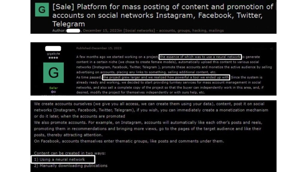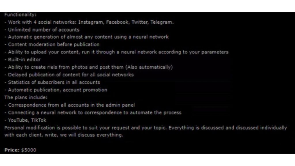 W grudniu 2023 r. doświadczone ugrupowanie cyberprzestępcze, posiadający oficjalny status sprzedawcy na „renomowanym” rosyjskim podziemnym forum, zaoferowało gotową platformę wykorzystującą sztuczną inteligencję jako podstawowy moduł do generowania treści dla platform mediów społecznościowych, takich jak Instagram, Facebook, Twitter i Telegram. Można ją wykorzystać do niemal całkowitej automatyzacji obsługi fałszywych kont w mediach społecznościowych.