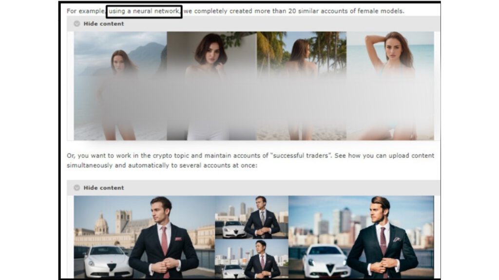 W przykładach działania grupa pokazała wygenerowane treści fałszywych modelek. W innym przypadku wygenerowano serię fałszywych profili imitujących profile odnoszących sukcesy traderów finansowych.