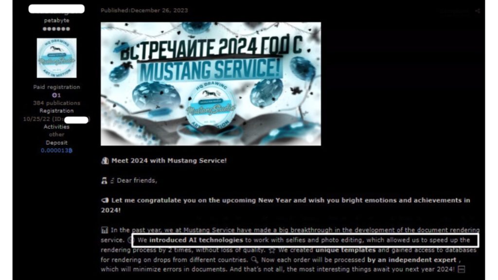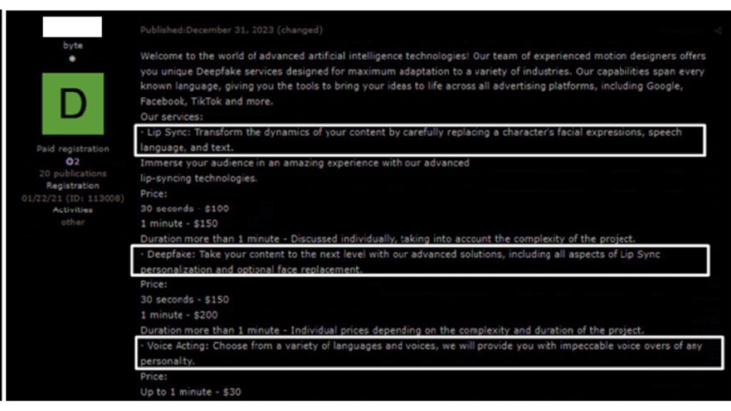 31 grudnia, w noc sylwestrową, na głównym rosyjskim forum podziemnym wprowadzono kolejną usługę do podszywania się. Koncentruje się ona na świadczeniu usług deepfake opartych na sztucznej inteligencji w trzech obszarach: