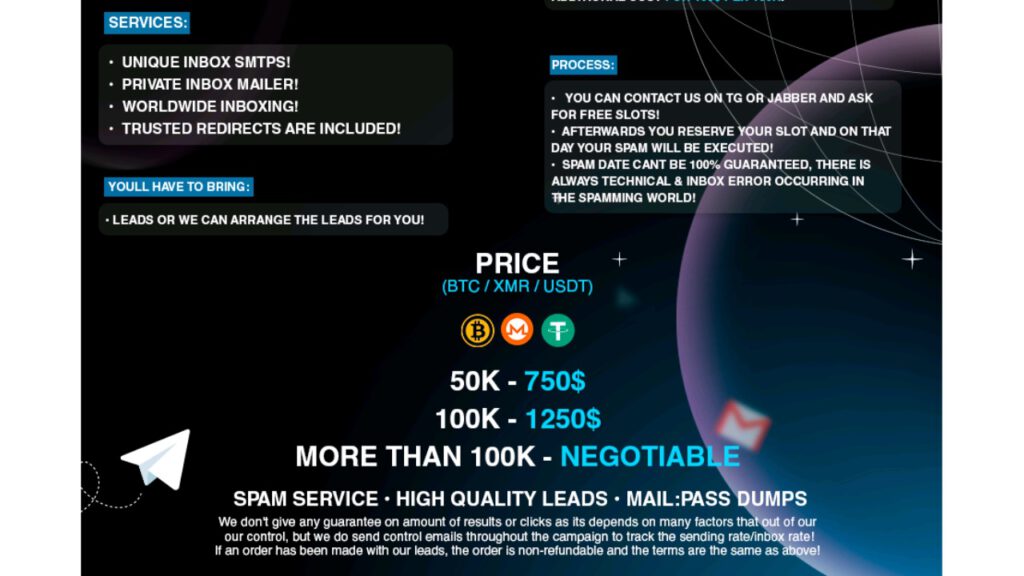 Ile przeciętny haker musi zainwestować, aby skutecznie dostarczyć 70 000 złośliwych e-maili? Pakiet 100 000 wiadomości spamowych kosztuje 1250 USD (można zapłacić w Bitcoinach, Monero lub USDT).