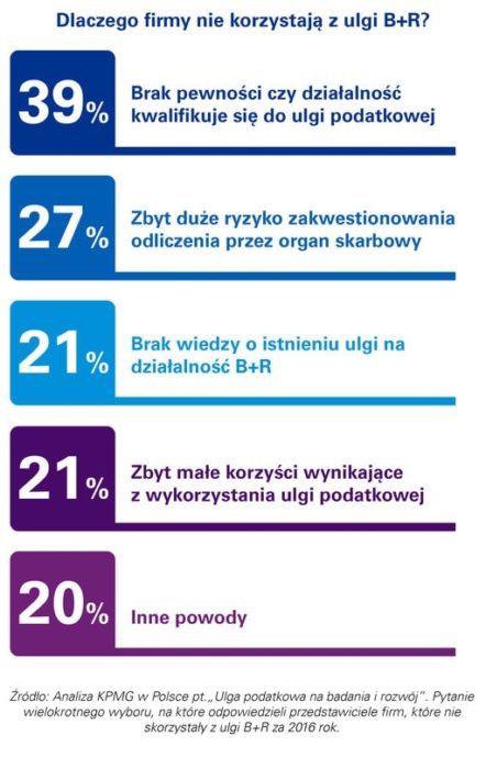 Dane pokazują raczej słaby bilans korzystania z B+R. Jedynie co dziewiąta przebadana firma, prowadząca prace badawczo-rozwojowe skorzystała z ulgi za 2016 rok. Aż 21% respondentów wciąż nie jest świadomych istnienia takiej możliwości obniżenia podatku dochodowego. Z kolei przedsiębiorcy, którzy świadomie nie decydują się na skorzystanie z ulgi B+R swoje decyzje motywują brakiem pewności, czy działalność kwalifikuje się do ulgi podatkowej oraz obawą, że odliczenie zostanie zakwestionowane przez organy skarbowe.