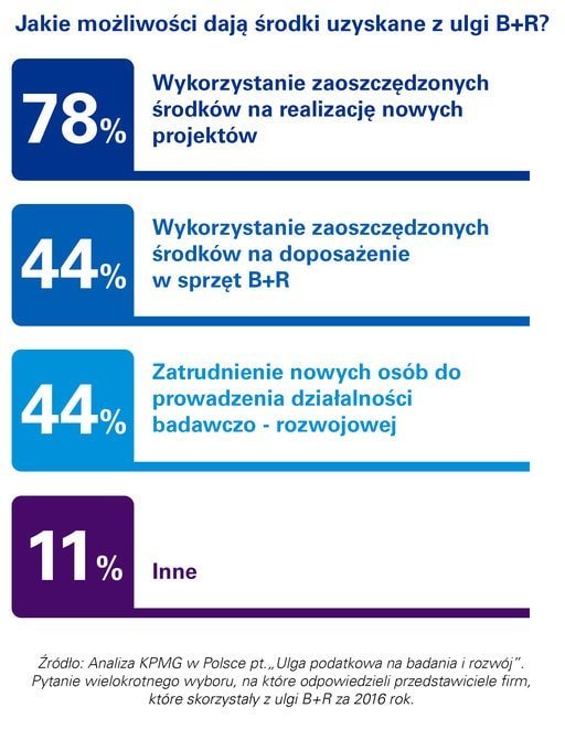 Dzięki możliwości rozliczenia nawet do 150% kosztów kwalifikowanych, korzyści wynikające z ulgi są namacalne i w znacznym stopniu mogą wspomóc budowanie przewagi konkurencyjnej na rynku. Prawie 8 na 10 firm, które wzięły udział w badaniu miało możliwość realizacji nowych projektów dzięki środkom uzyskanym z ulgi na badania i rozwój. Zaoszczędzone środki przedsiębiorstwa przeznaczają również na doposażanie w nowoczesny sprzęt oraz inwestycje w kapitał ludzki (po 44%).