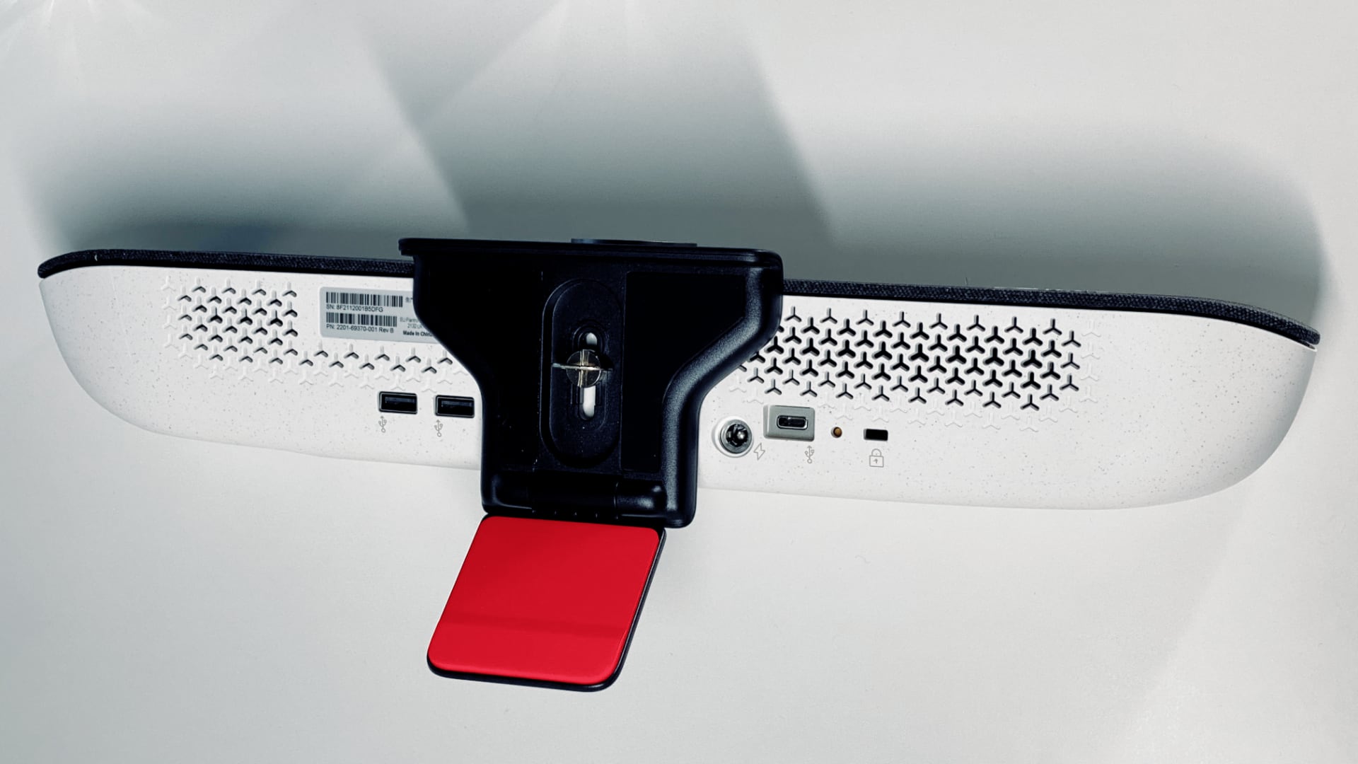 Poly Studio P15 zaskoczyło mnie przede wszystkim połączeniem świetnej, nowoczesnej koncepcji all-in-one z bardzo prostymi rozwiązaniami. Zacznijmy do montażu urządzenia. Wideobar posiada przykręcaną stopkę z dużą dowolnością regulacji przy montażu do górnej krawędzi ekranu monitora. Urządzenie jest dość ciężkie, co może stanowić problem przy montażu do bardzo płaskich ekranów. Ale myślę, że w większości przypadków nie będzie z tym problemu. Na moim BenQ PD 3220U trzyma się bardzo dobrze.